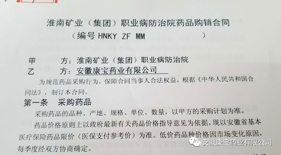6月9日,康寶藥業(yè)與淮南礦業(yè)(集團(tuán))職業(yè)病防治院簽訂藥品購銷合同。